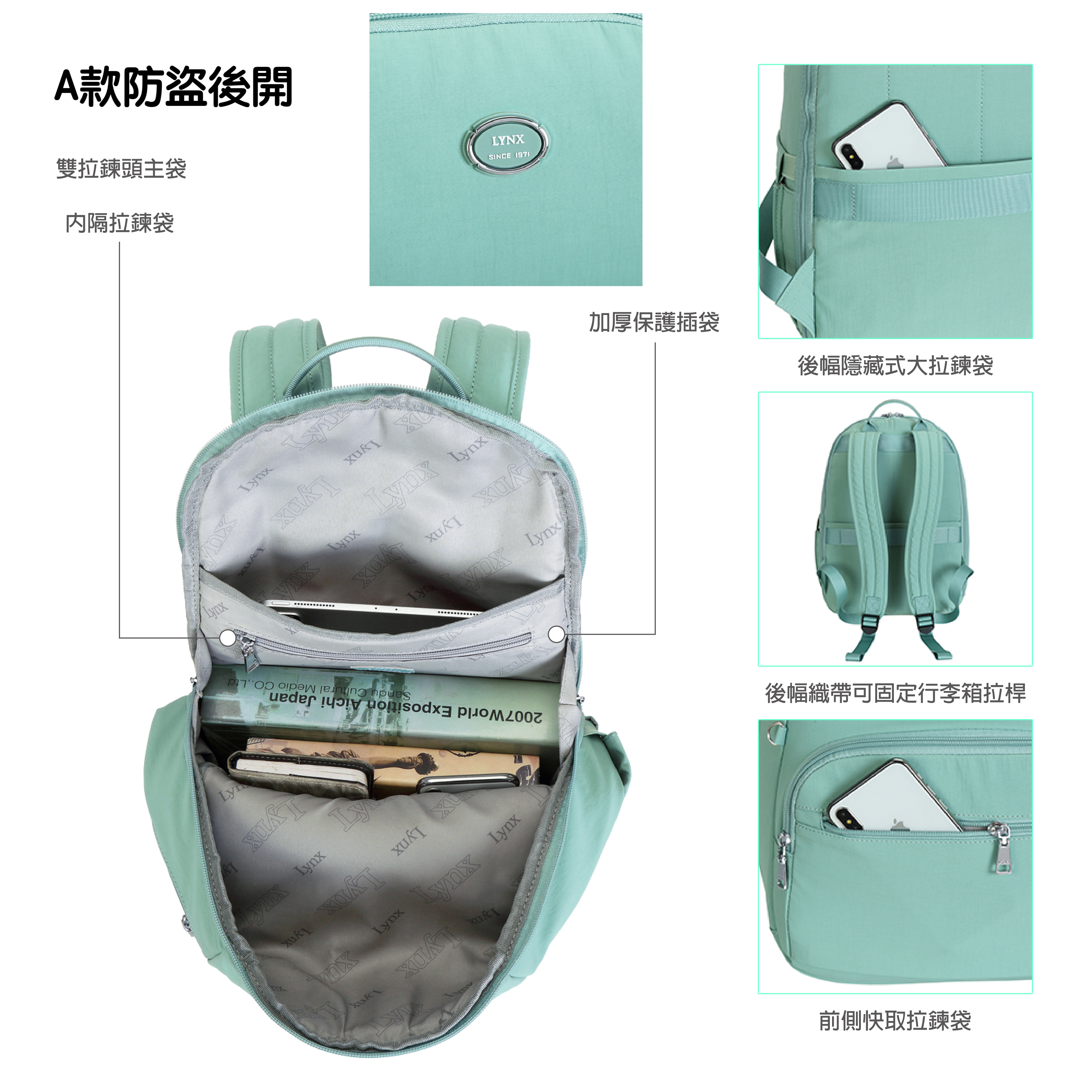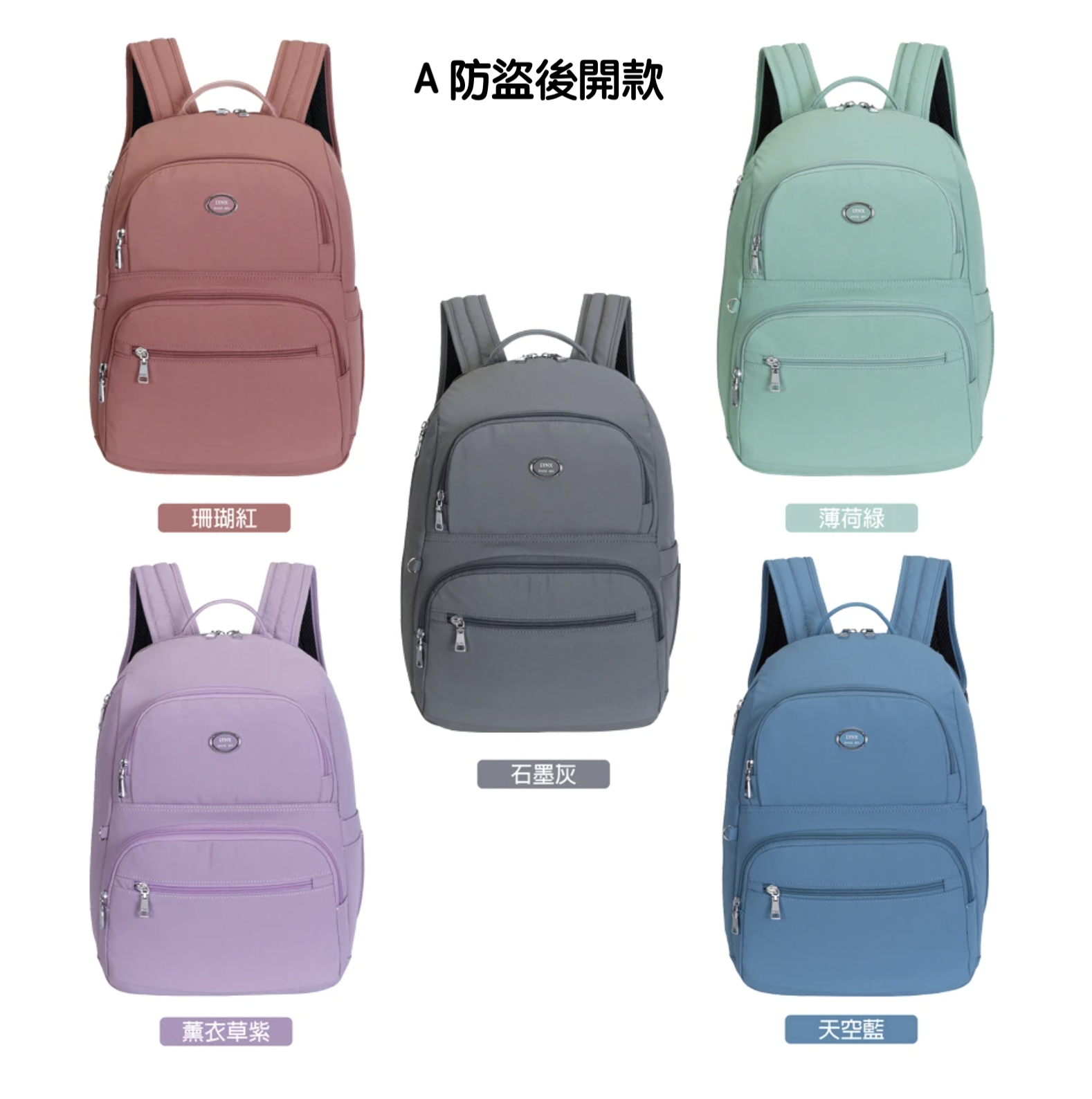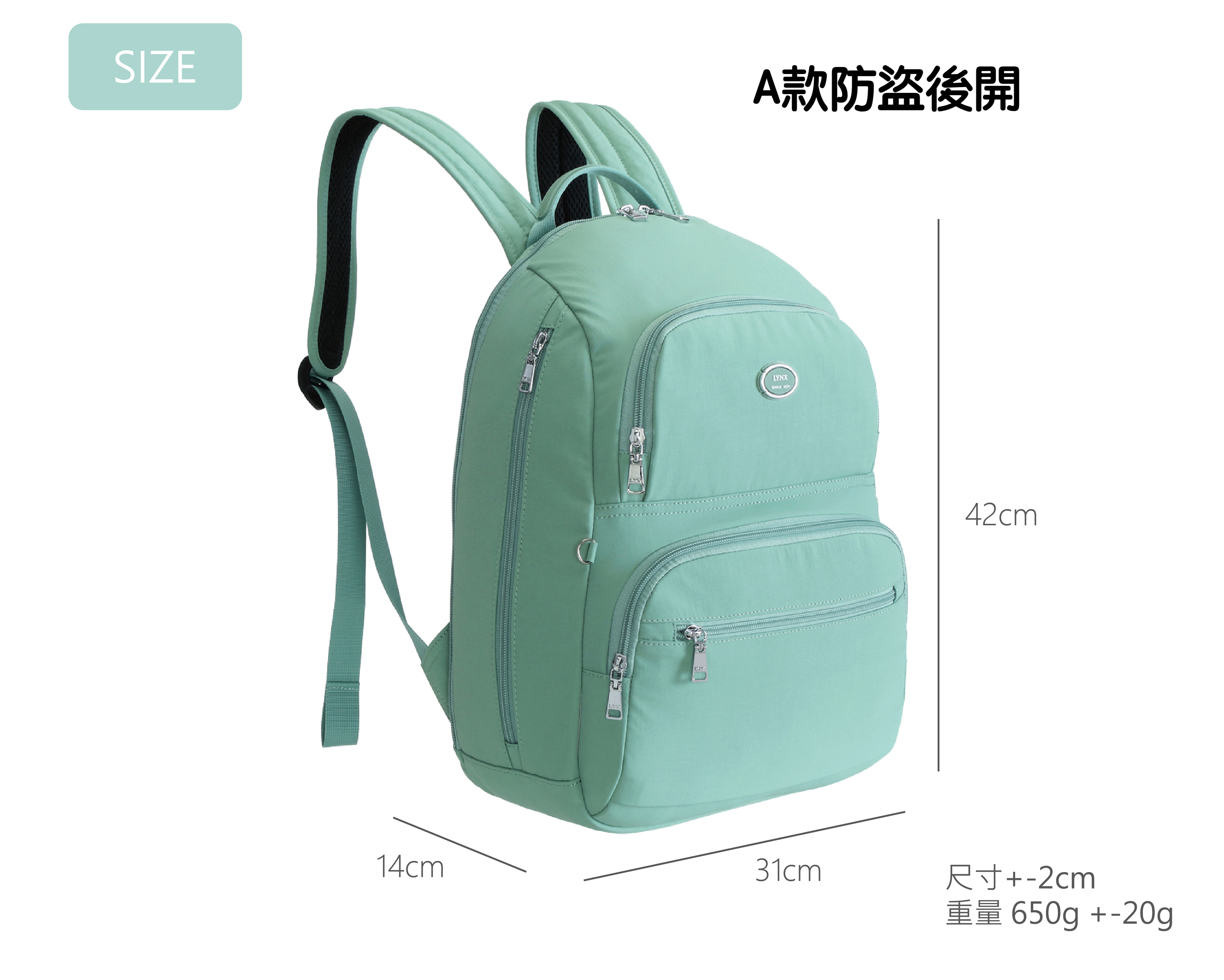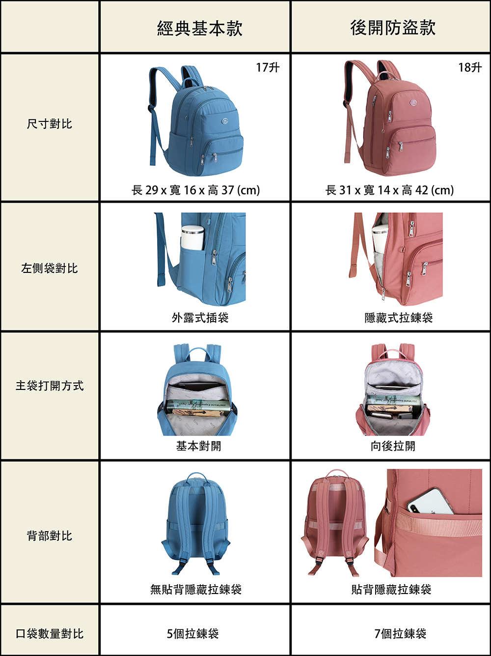 A款防盜後開背包約為750公克,B款經典基本背包約為580公克